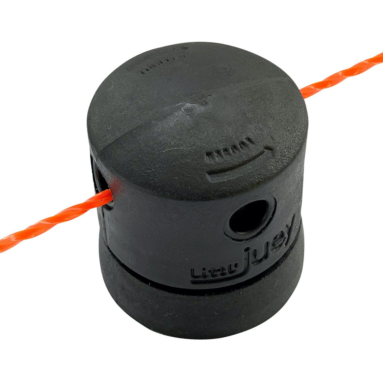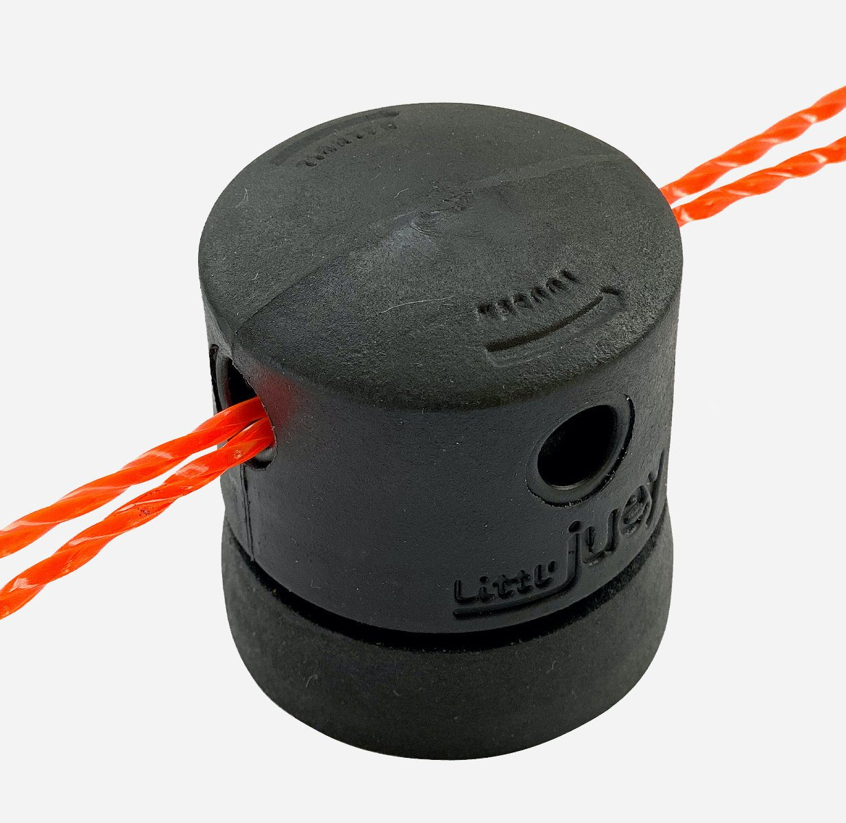 Your high performance Littl' Juey cutting head consists of two parts that assemble together within seconds to contain pre-cut strips of cutting line. The parts fasten together on a large thread which enables the top part of the head to be easily adjusted 90 degrees for insertion of new reloads; rotation of the trimmer head tightens the strips of line within the assembly during use.